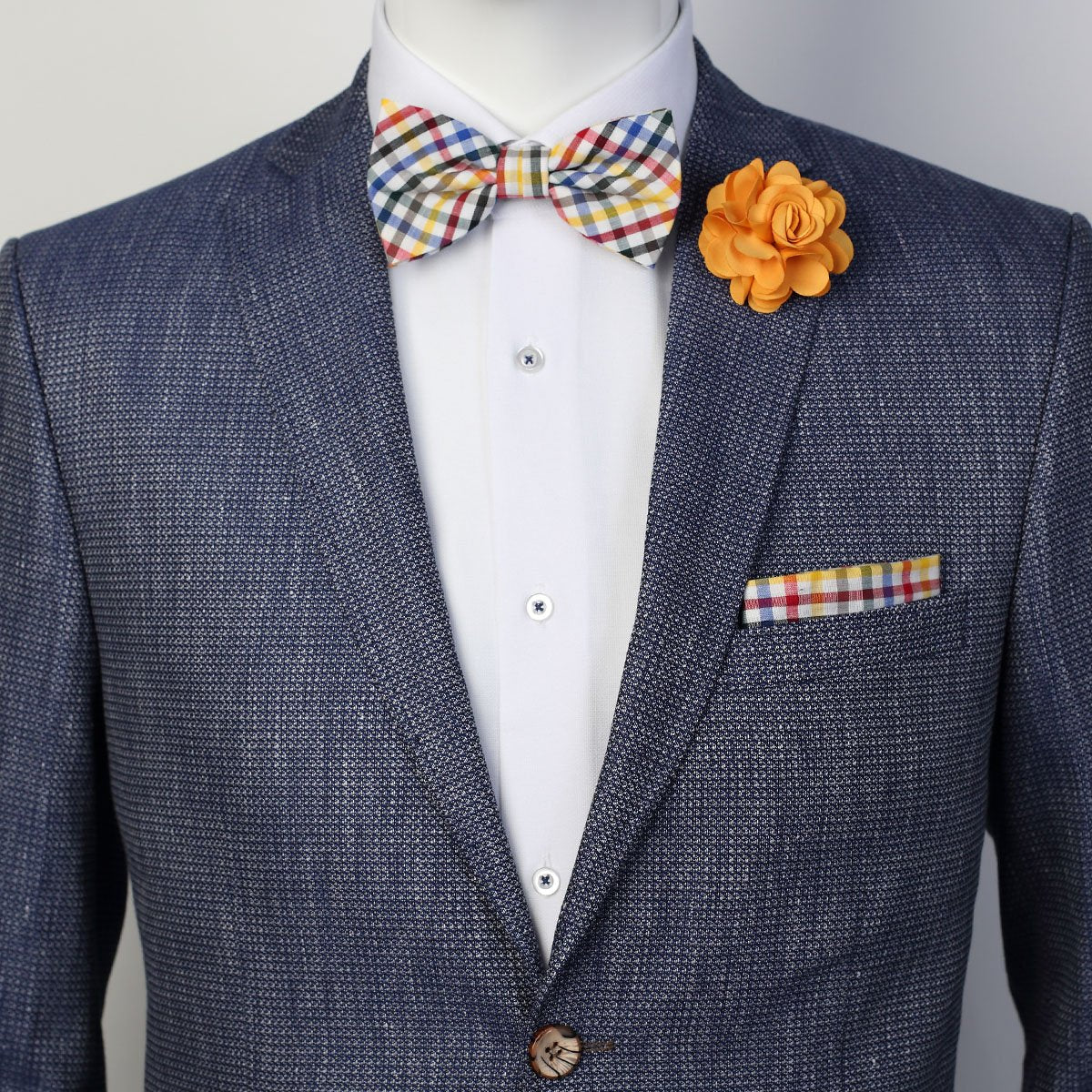 - A Luxury Cotton Mini Check Pocket Square, Flower and Bow Tie Combo